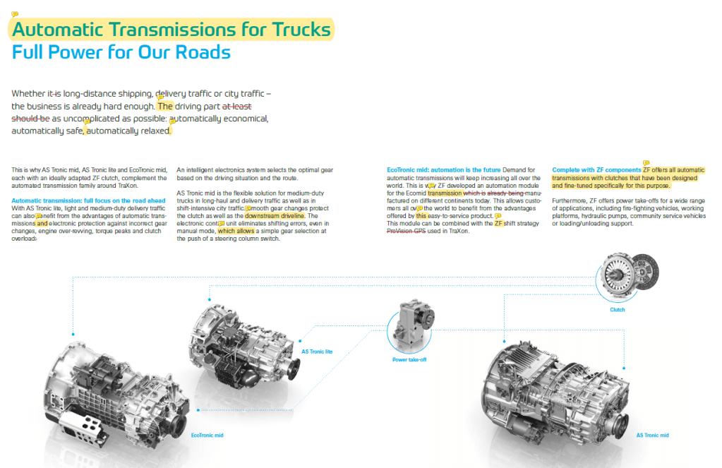 Here is one of my more recent projects, which was an audit of two product brochures related to bus technology. Both versions have been included, as well as an annotated copy of the suggestions I have made.